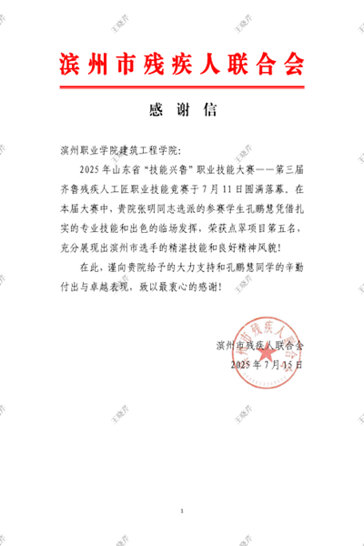 2025 年山东省“技能兴鲁”职业技能大赛--第三届齐鲁残疾人工匠职业技能竞赛于7月 9 日至11日在鲁中高级技工学校成功举办。赛后,滨州市残疾人联合会向我校bw必威西汉姆联发来感谢信,对学院给予竞赛的大力支持以及参赛学生的出色表现表示衷心感谢。此次大赛由省残联、省总工会共同主办,吸引了来自全省16市及山东特殊教育职业学院的17支代表队、220余名优秀残疾人选手同台竞技。大赛设置了信息通信及新一代信息技术类、美术专业类、手工业类等五大类9个竞赛项目。...